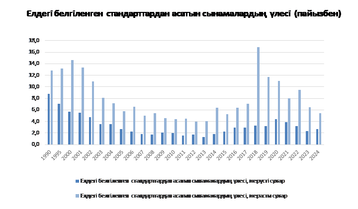 Бұл көрсеткіш су жүйесіне жататын әртүрлі көздерден (сумен жабдықтау кәсіпорындары, ашық су қабылдағыштар, жер асты сулары) алынған ауыз су сынамаларының жалпы санындағы ұлттық сапа стандарттары асып түсетін ауыз су сынамаларының үлесін көрсетеді.