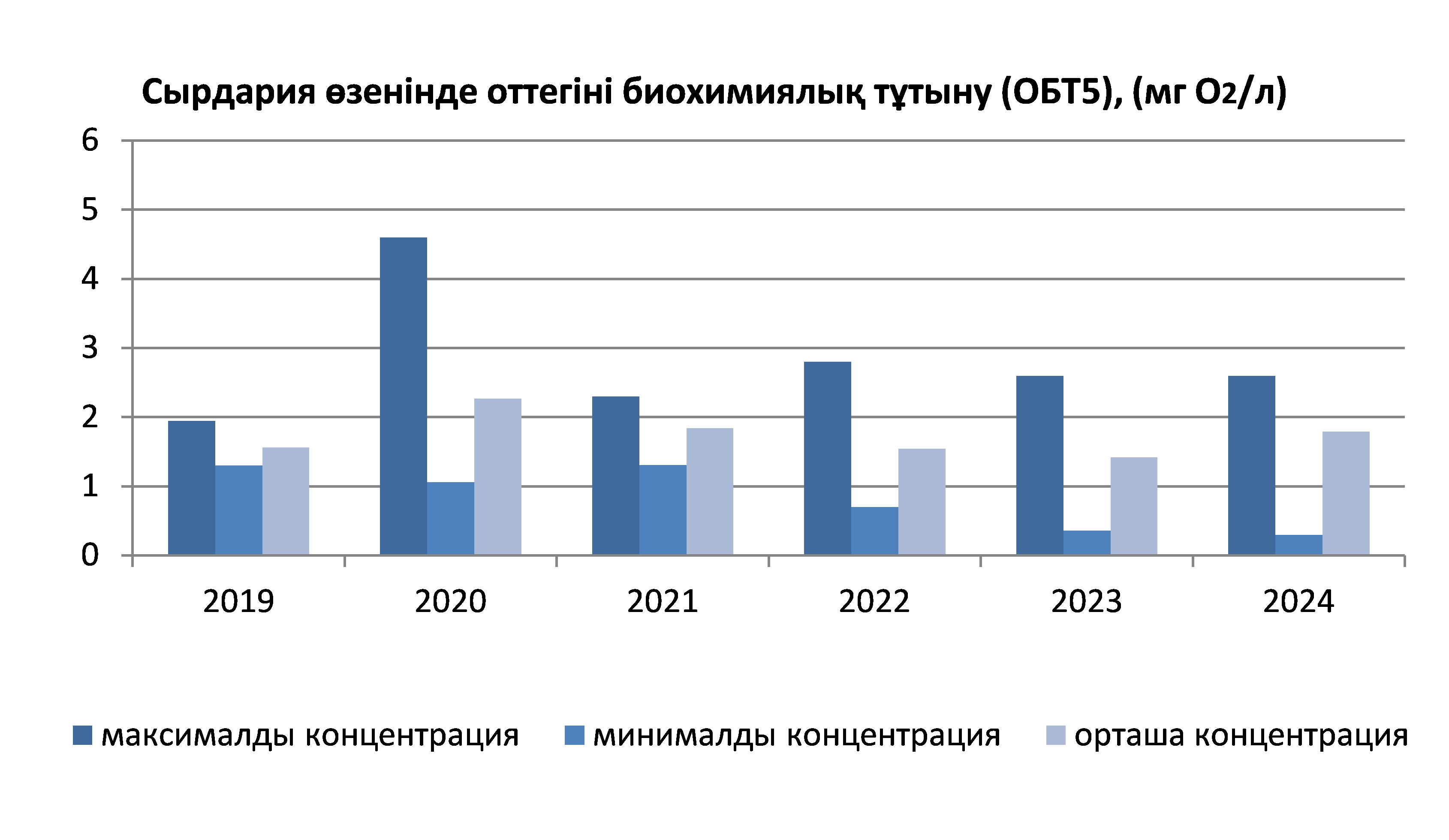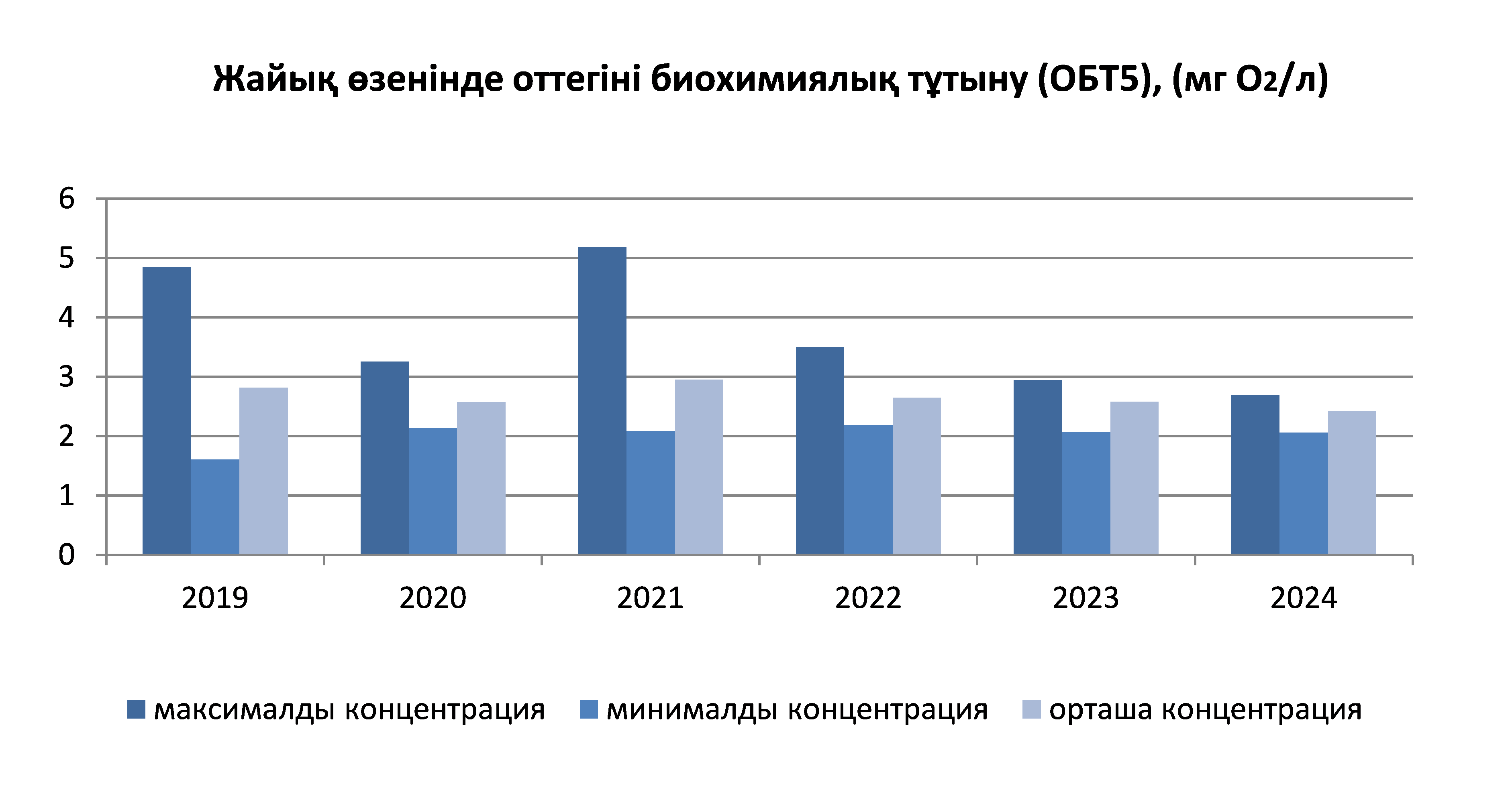 Оттегіні биохимиялық тұтыну көрсеткіші болып табылатын су айдындарындағы оттегі құрамының деңгейі (БПК), яғни суда болатын органикалық заттардың аэробтық ыдырауы үшін ағзалар тұтынатын ерітілген оттегінің мөлшері және өзендердегі аммоний азотының шоғырлану деңгейі (NH4/NNH4).