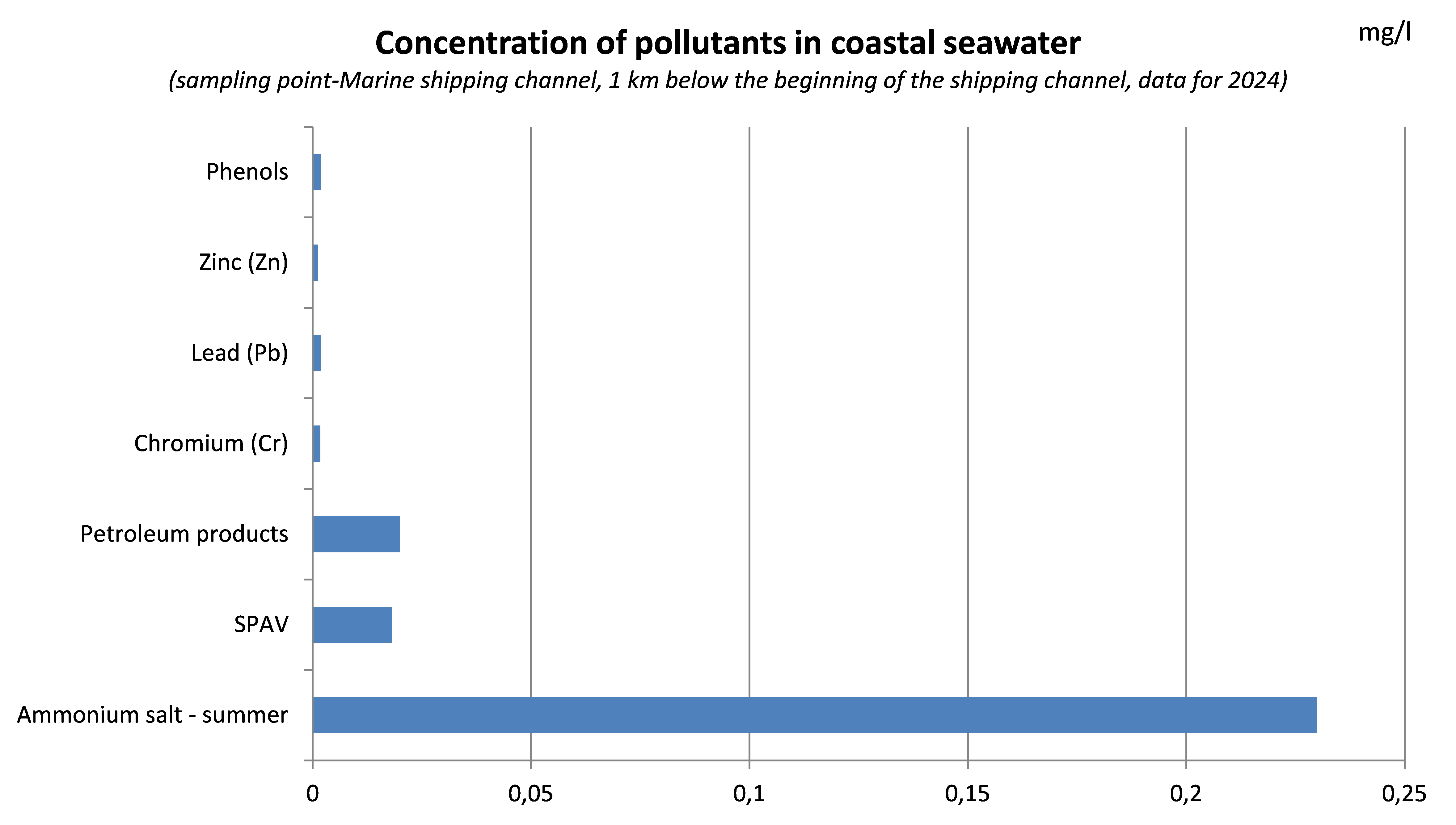 The indicator shows the concentration of the organic substances, synthetic surface-active compounds (SSAC), heavy metals in coastal seawater and sediments. The indicator provides a measure of the state of coastal seawaters and sediments in terms of pollutant concentration. Sources of pollution include discharges from wastewater treatment plants, industrial effluents and agricultural run-off.