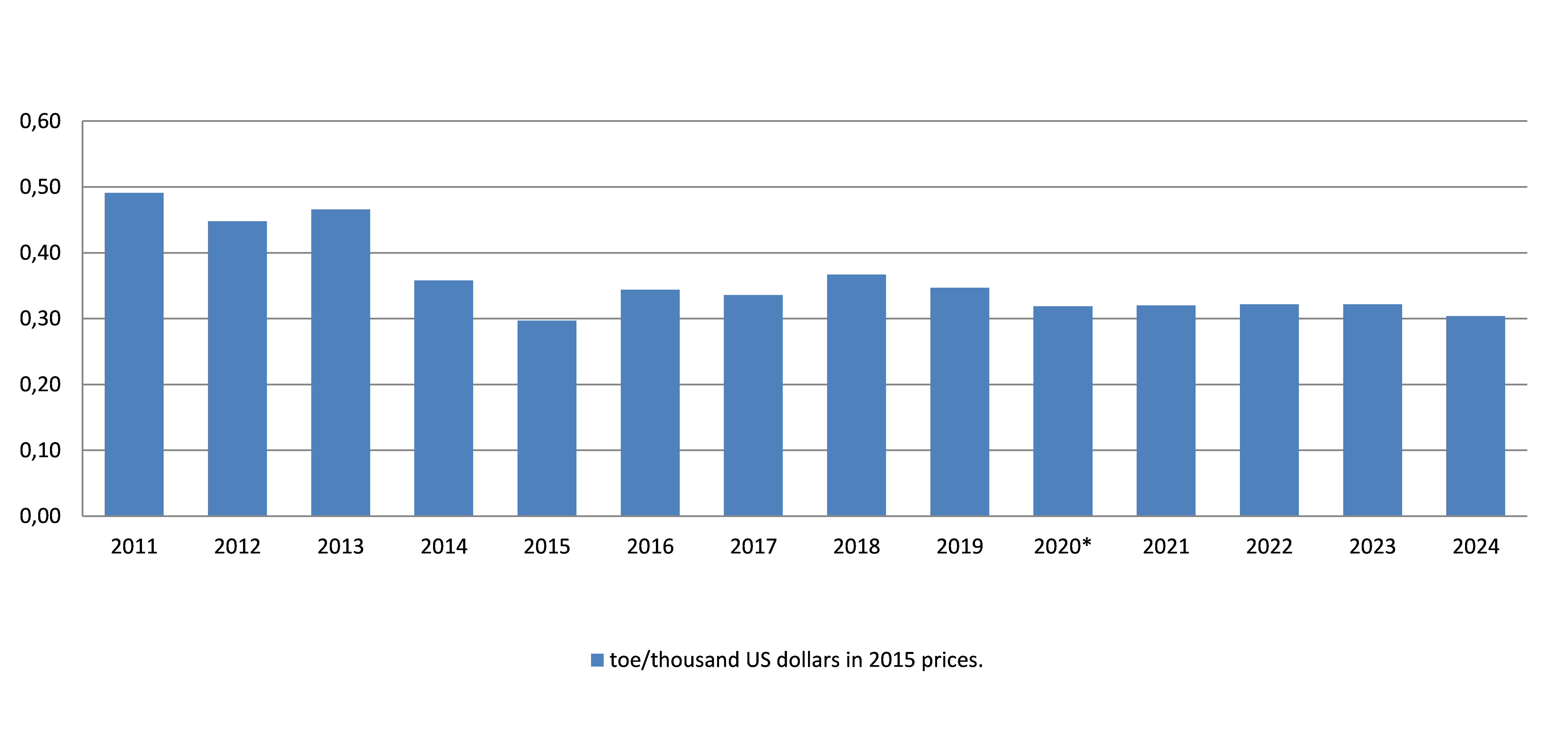 This indicator describes the level of efficiency of energy consumption in the country. The indicator is the ratio between final energy consumption (and/or total primary energy supplied) and gross domestic product (GDP), calculated for a calendar year at constant prices based on purchasing power parity (PPP).