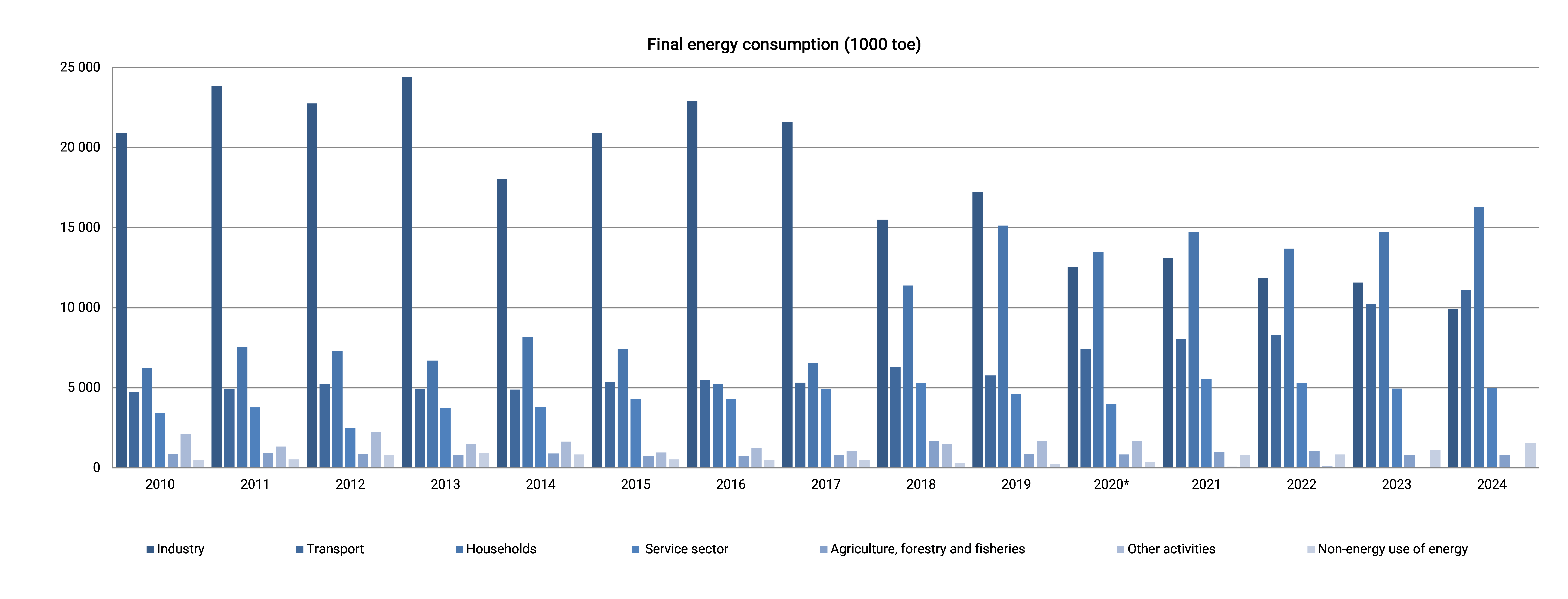 This indicator describes the final consumption of energy supplied to the final consumer for use in all energy purposes, both in General and by main consumers (industry, transport, households, services and agriculture) in accordance with the international standard industrial classification of economic activities (ISIC).Final energyconsumption includes fuel used for energy purposes, except for fuel consumed by energy enterprises for conversion to other types of energy (electricity, heat, gas) and equipment operation.