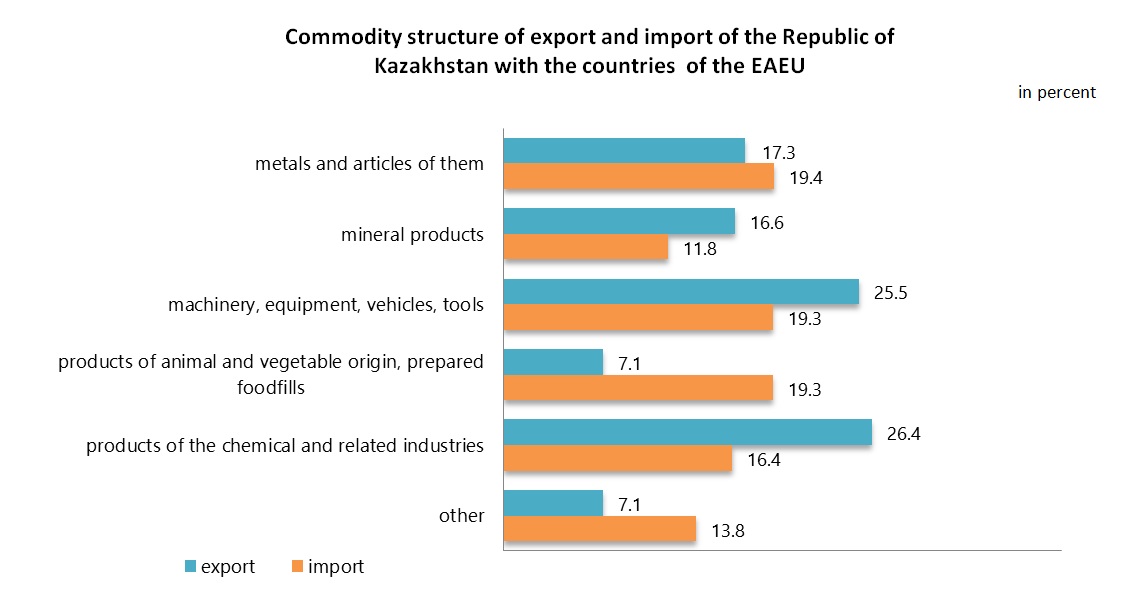 The largest share in exports with the EAEU countries is occupied by products of the chemical and related industries – 26,4%, followed by machinery, equipment, vehicles, tools – 25.5%.