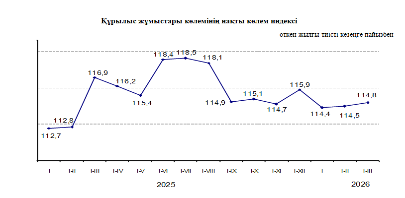 2026 жылғы қаңтар-наурызда орындалған құрылыс жұмыстарының көлемі 14,8% өсіп, 1231,4 млрд. теңгені құрады. Құрылыс жұмыстары көлемінің өсуі негізінен құрылыстарды салу және жөндеу жұмыстарының ұлғаюымен (37,5%-ға) байланысты.