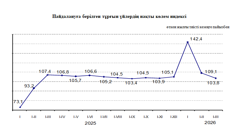 2026 жылғы қаңтар-наурыз айларында пайдалануға берілген жаңа нысандардың жалпы алаңы 4 846,9 мың шаршы метрді құрады. Пайдалануға берілген тұрғын үйдің жалпы алаңы 2025 жылғы қаңтар–наурызбен салыстырғанда 3,8%-ға өсіп, 3 869,4 мың шаршы метрге жетті.
