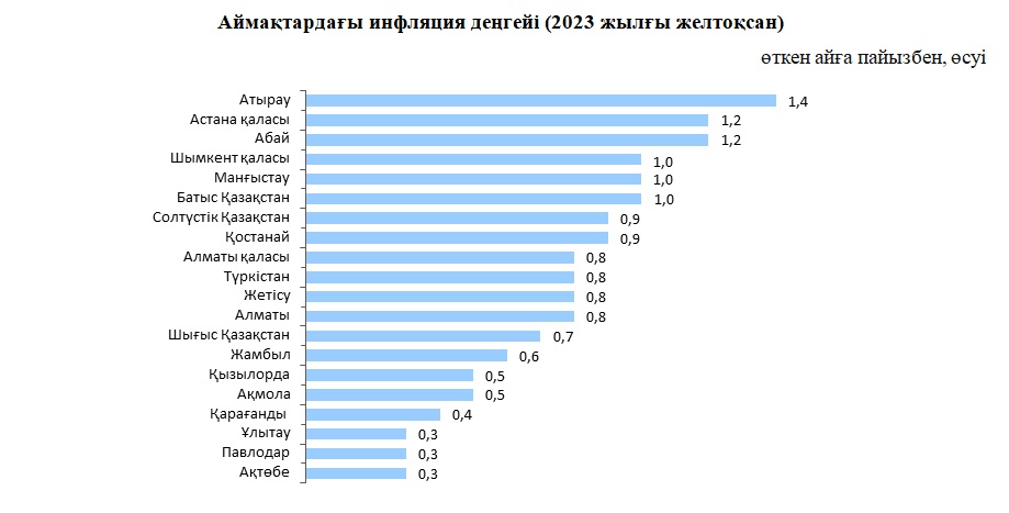 Өңірлер арасында ең жоғары айлық инфляция Атырау облысында – 1,4% (орташа республикалық деңгейден 0,6 п.т. жоғары), ең төменгі – Ұлытау, Ақтөбе Павлодар облыстарында 0,3%-дан тіркелді.