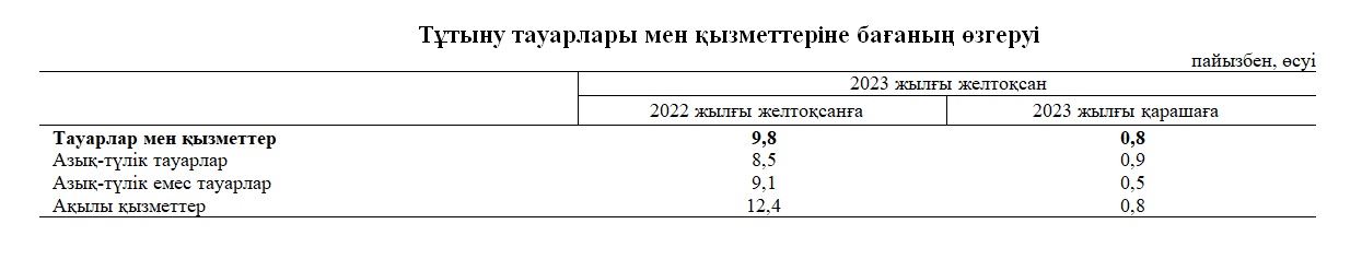 2023 жылғы желтоқсанда тұтыну бағаларының айлық индексі баяулап, 0,8% құрады (2023 жылғы қарашада – 1%). Азық-түлік тауарларының бағасы 0,9%, ақылы қызметтер – 0,8%, азық-түлікке жатпайтын тауарлар 0,5% өсті.