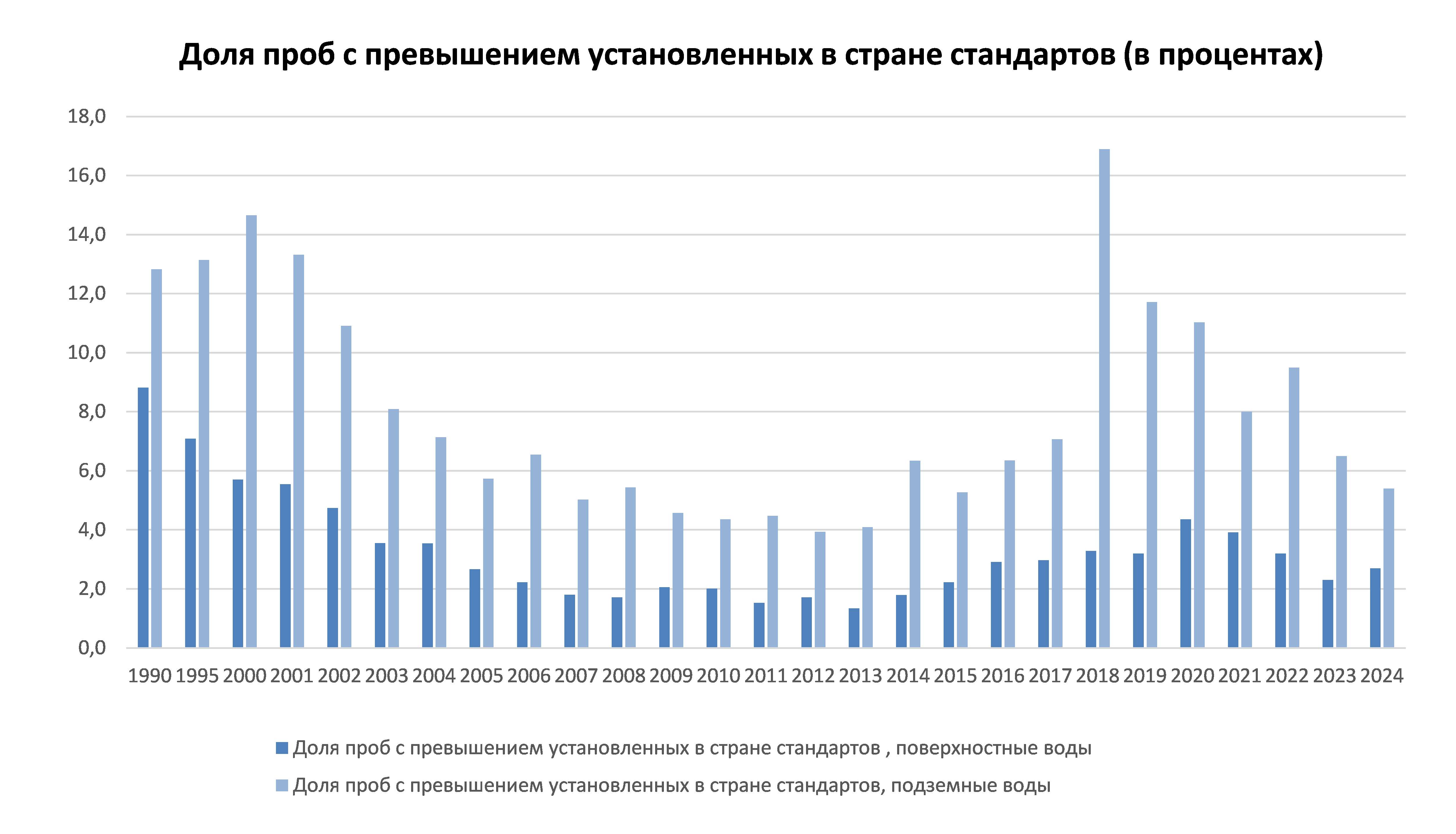 Этот показатель показывает долю проб питьевой воды, в которых превышаются национальные стандарты качества, в общем количестве проб питьевой воды, отобранных из различных источников, относящиеся к системе водой (предприятия водоснабжения, открытые водозаборы, подземные воды).