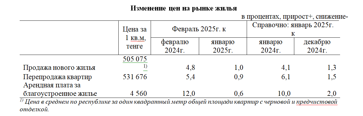 Количество сделок купли-продажи жилья за февраль 2025 года по сравнению с соответствующим месяцем прошлого года уменьшилось на 5%, тогда было зарегистрировано 30 534 сделок. Наибольший рост сделок был отмечен в области Ұлытау (51,2%), наименьшее снижение – в Кызылординской области (-22,9%). Уменьшение наблюдается в количестве сделок за январь-февраль 2025 года по сравнению c январем-февралем 2024 года – на 3,7%.