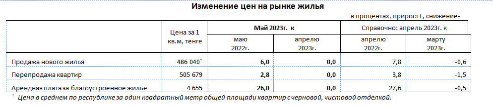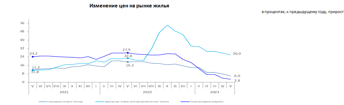 За год (май 2023г. к маю 2022г.) цены на квартиры на вторичном рынке повысились на 2,8%, новое жилье – на 6%. Арендная плата за благоустроенное жилье в мае 2023г. по сравнению с аналогичным месяцем прошлого года повысилась на 26%.