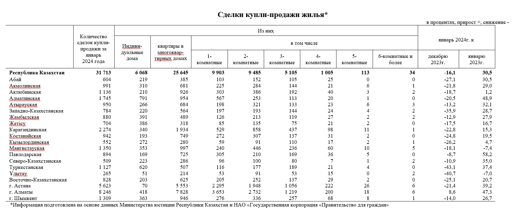 Количество сделок купли-продажи жилья за январь 2024 г. по сравнению с соответствующим месяцем прошлого года увеличилось на 30,5%, тогда было зарегистрировано 24 294 сделок. Положительный показатель был зарегистрирован во всех регионах страны, кроме Мангистауской области и области Ұлытау, где уменьшение составило 7,4% и 7% соответственно. Самое большое увеличение зафиксировано в Павлодарской области (на 58,2%).