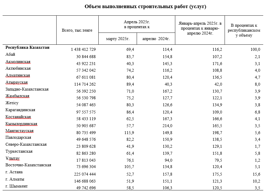 В январе-апреле 2025г. объем строительных работ увеличился на 16,2% и составил 1438,4 млрд. тенге. Увеличение объема строительных работ связано с работами по строительству и ремонту сооружений(на 19,2%) и нежилых зданий (на 15,3%).
