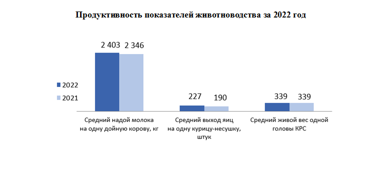 За 2022г. средний надой молока на одну дойную корову по сравнению с 2021 годом увеличился на 2,4%, средний выход яиц на одну курицу-несушку – на 19,5%, средний живой вес одной головы КРС забитых в хозяйстве или реализованных на убой сохранился на уровне 2021 года.