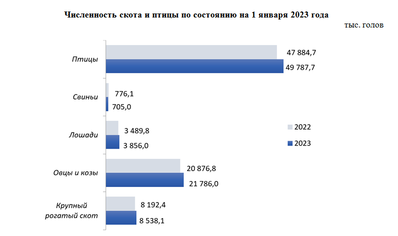 Численность скота и птицы за год изменилась следующим образом (по состоянию на 1 января 2023 года):поголовье лошадей увеличилось на 10,5%, верблюдов – на 6,5%, крупного рогатого скота – на 4,2%, овец и коз – на 4,4%, птиц – на 4%, поголовье свиней уменьшилось на 9,2%.